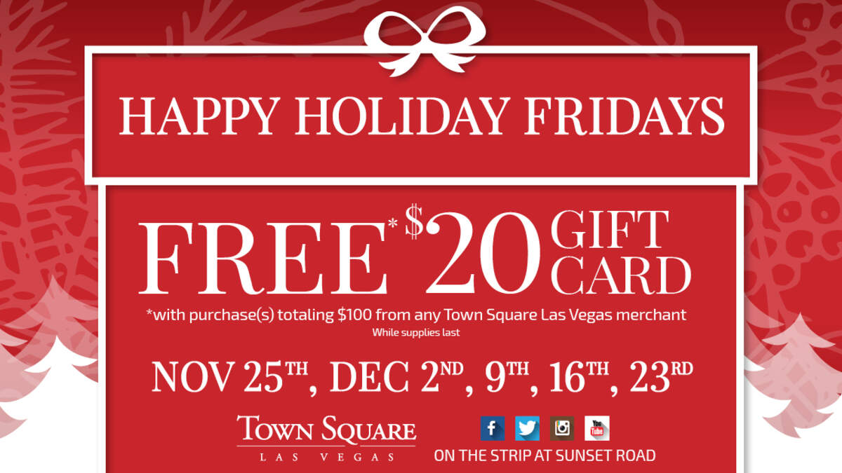 Every Friday, November 25th through December 23rd at Town Square Las Vegas, you’ll find amazing savings at over 120 stores like H&M, Saks Off 5th, Old Navy, Apple, Victoria’s Secret, and many more. And while supplies last, with any original receipt of $100 or more from any participating Town Square Las Vegas merchant, you will receive a free $20 Town Square Las Vegas Gift Card. The Free Gift Cards will be available with original receipt at the Concierge Booth starting on Friday, November 25th through December 23rd.