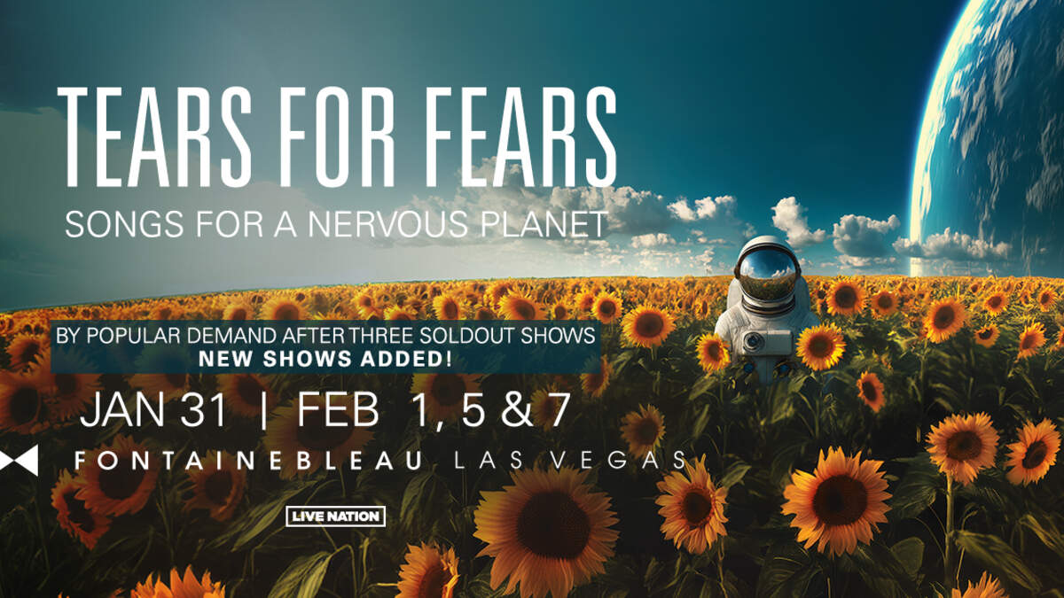 Tears For Fears has just announced four additional shows at Fontainebleau Las Vegas January 31 through February 7th! Tears For Fears: Songs For a Nervous Planet goes on sale Friday, November 8 at 10 AM PT at Ticketmaster.com