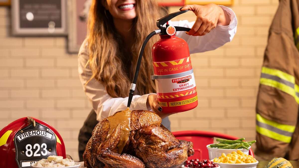 Firehouse Subs, the sandwich chain founded by former firefighters has launched a limited-edition “Gravy Extinguisher” just in time for Thanksgiving. The device, which resembles a classic fire extinguisher, can hold up to two liters of hot gravy and allows users to pump it directly over their turkey.